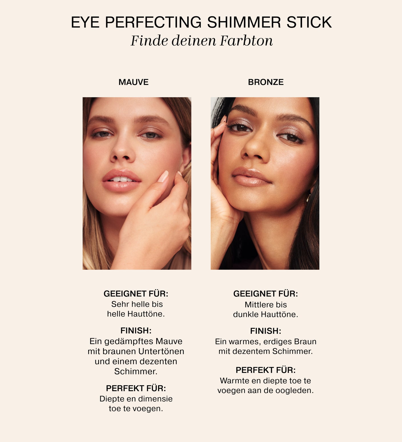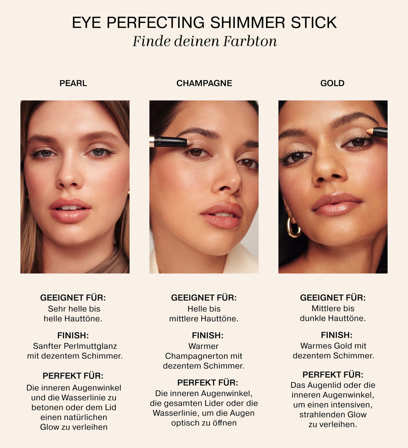 Geeignet für empfindliche haut Der Eye Perfecting Shimmer Stick wurde für empfindliche Haut entwickelt und lässt sich sanft auftragen. Er ist daher auch für empfindliche Augen oder Kontaktlinsenträger innen geeignet, die sich einen sicheren, strahlenden Look wünschen.
