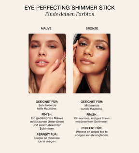Hält den ganzen tag Die falten- und wischfeste Formel sorgt dafür, dass der Eye Perfecting Shimmer Stick von morgens bis abends hält - kein Nachschminken erforderlich. Ideal für den ganztägigen Gebrauch.